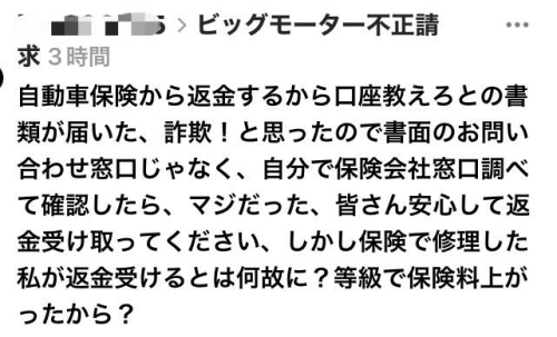 このユーザーは、保険会社のふるまいにより『保険契約が『かかった修理代を代理で払う』と思い込んでいて疑問に思ったが、民法上の関係からいくと「ビックモーターが余計に取った修理代を返金する」のは民法上の筋道なんでしょうけど、「使わなかった保険金は保険会社のもの」と豪語している保険会社もありますので、ビックモーターから『使われなかった保険金をとった』んでしょうね。取ったものの保険金の所有者はこのユーザーさんだから『精算行為を誘導した保険会社』は、裁判上なんの根拠もない『清算』をしてしまったので、このユーザーさんとビックモーターの『精算』に対してお金を返さなきゃ泥棒なので、第三者なのでこんな返し方をしたんじゃないかと思う訳です。